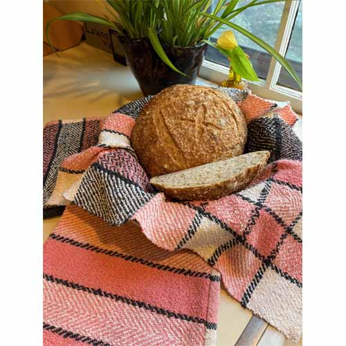 Embrace the fun texture of Cotton Bouclé in this set of towels. They are woven in a 4-harness twill variation that creates lines and zig zags. The pattern is not overly busy so it don't compete with the frizzy fabric surface. Three colors are used in the striped warp, sett at 15 epi. The kit makes three different but coordinated towels: one woven entirely with Charcoal, one woven entirely with Salmon, and one woven with stripes of all three colors. The next time you have fresh-baked bread, settle the loaf into a nest of your handwoven towel and know that this is what life is meant to be! The kit makes three hemmed towels measuring approximately 16.5" x 19". They can be machine washed and dried.