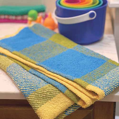 Cotton Boucle has a fun, spongy texture that any baby would love to sink into. This easy color block bath towel is a 2/2 twill, a quick weave with easy-to-remember threading and treadling sequences. Perfect for that last-minute baby shower that you just remembered! The warp and weft are both the Cotton Boucle, striped in both directions for bold color. The warp is sett at 15 epi. The kit makes one hemmed towel with finished dimensions of 31.5" x 33".