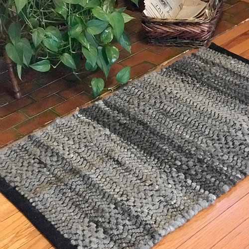 Our rug was woven using Quebecoise color 99 Black for the warp and Corespun Alpaca in color 5 Light to Medium Gray for the weft.