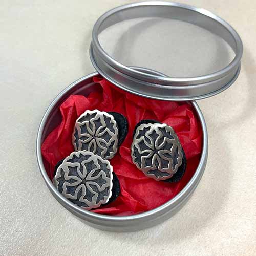 The design is rendered in white brass with a leather backing. The studs measure approximately 1" across. They are sold as a set of four and come packaged in a reusable tin.