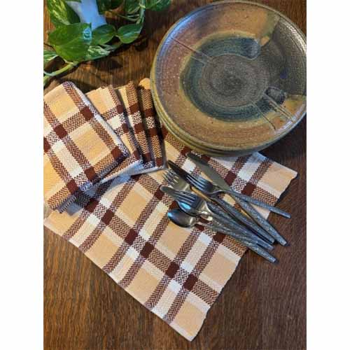Stop buying (and throwing away) paper napkins! Instead, make several sets of cloth napkins that you can reuse for years. This set is woven from 8/2 unmercerized cotton. The warp is sett at 20 epi and threaded in a 4-harness twill variation. The same three colors are used in both the warp and the weft, and because we carry 78 colors in this yarn, you can easily customize it to match your kitchen or dining room. (Or sofa--no judgement here!) The kit makes 4 or 6 hemmed napkins, each approximately 13" x 13". They can be machine washed and dried.