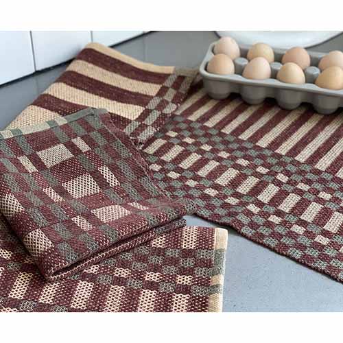Our towels are woven using 8/2B Cotton in colors 5212 Honey and 1244 Olive with Cotton Chenille 908 Medium Brown.