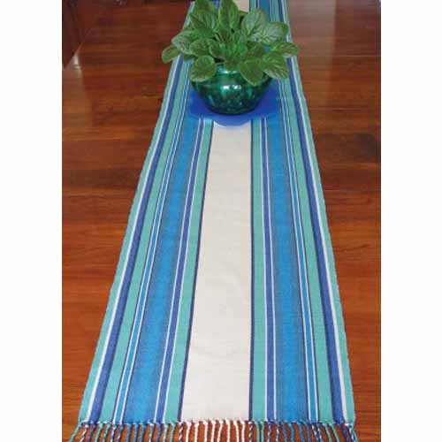 You don't have to be in Tahiti to feel like you are in paradise. Spread this runner on your patio table, get out the mai tais and put your feet up. The runner is woven in 10/2 Perle sett at 40 epi. It is woven in a slightly warp-faced plain weave, for a shimmery surface that makes the most of the ocean colors. The kit makes one runner with finished dimensions of 15.25" x 72"plus twisted fringe. It can be hand washed and air dried.