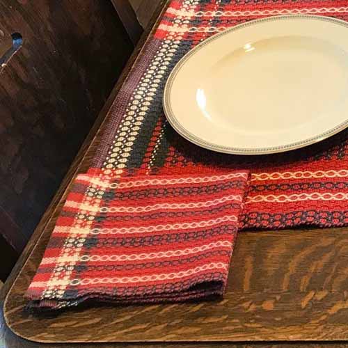 These napkins are part of our coordinated set celebrating Yarn Barn's 50th anniversary. They are woven in the same three colors as the runner and placemats but using a finer yarn--8/2 cotton sett at 24 epi. They are threaded in a simple point twill and woven with an easy 6-pick repeat. The kit makes four hemmed napkins measuring approximately 12.5" x 13". They can be machine washed and dried.